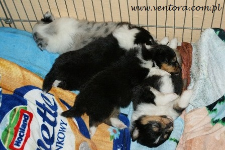 11 maja 2010 urodziły się szczenięta, 2 pieski ( tricolor) oraz 2 suczki( tricolor i blue merle) :